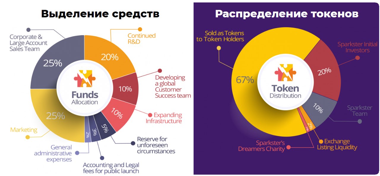 На было выпущено 290 млн. токенов, 67% из которых предназначены для продажи инвесторам. Остальные распределяются следующим образом: 20% закрепляются за аукционерами площадки, для дальнейших выплат; 10% в распоряжение команды; 3% на прочие нужды. Первый этап торгов уже успешно завершился и собрал $30 млн. Это грандиозный успех для любого блокчейн проекта, но команда из Sparkster продолжают активно развивать площадку и решать проблемы по мере их обнаружения. В будущем будет объявлен дополнительный сбор средств.