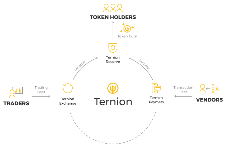 Чтобы облегчить надежную ликвидность, Ternion работает вокруг финансовой модели, основанной на рыночных силах. Финансовая модель Ternion и экосистема, которая ее поддерживает, обеспечивают токен Терниона. Тонер Терниона (TRN) является неотъемлемой частью Экосистемы и служит в качестве национальной валюты для трех фундаментальных основ Терниона: Биржи, Тернионных Платежей и Резерва ликвидности.