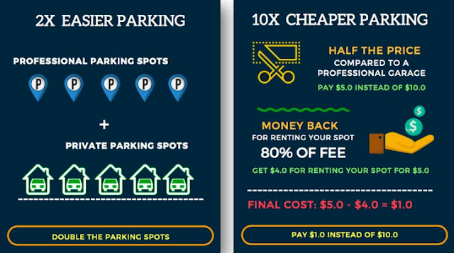 Reduce aún más el gasto real de estacionamiento en un 80%. En una situación óptima donde un conductor alquila un lugar P2P de $ 5.02 al mismo tiempo, recibe $ 4.0 al dejar su espacio de estacionamiento privado a otra persona (estacionamiento 5 veces más barato).