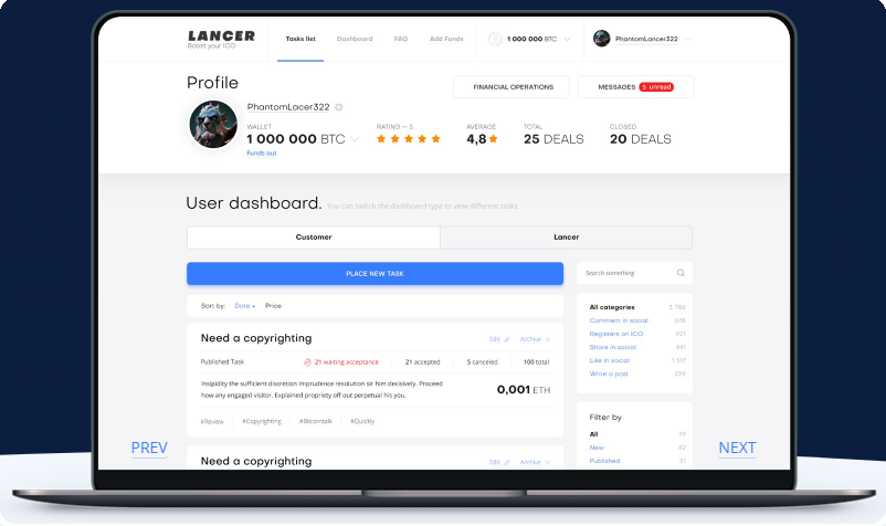 Now, using the Lancer Network project, each participant will be able to perform simple actions, such as registering on websites, comments on social networks, writing texts, subscribing to groups and receive remuneration for it. The project itself has several advantages compared to similar sites. The most important difference is the transparent payment system, which is well protected and its impossibility to deceive. All payments are made only after the completion of the tasks, the tokens from the client’s account will be charged only during the formation of the request. And this suggests that the platform with the help of a block chain is responsible for all fair payments of the parties involved in the transaction.