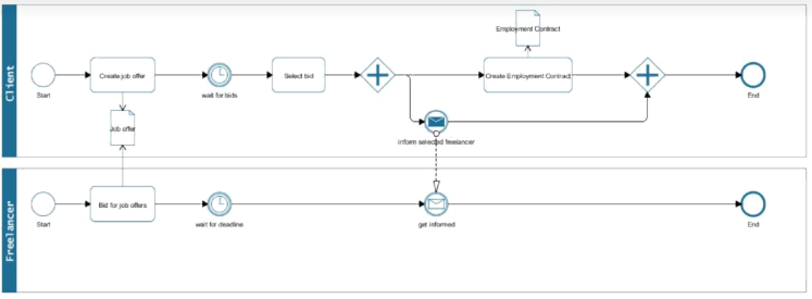 Этот образ иллюстрирует процесс предложения занятости и торги на работу. Можно заметить, что сначала клиент создает новую работу. Клиент прикрепляет льготный период для новой работы создан. Это означает, что клиент должен выбрать ставку до достижения крайнего срока. После предложения о трудоустройстве независимые работники могут работы. Предложение фрилансера содержал зарплату фрилансер хочет получить оплату для этой работы. Когда клиент выбирает фрилансера и его предложение, договор Работа выполнена. Трудовой договор обязательного заработной платы фрилансеров, так что оплата фрилансер будет обеспечена.