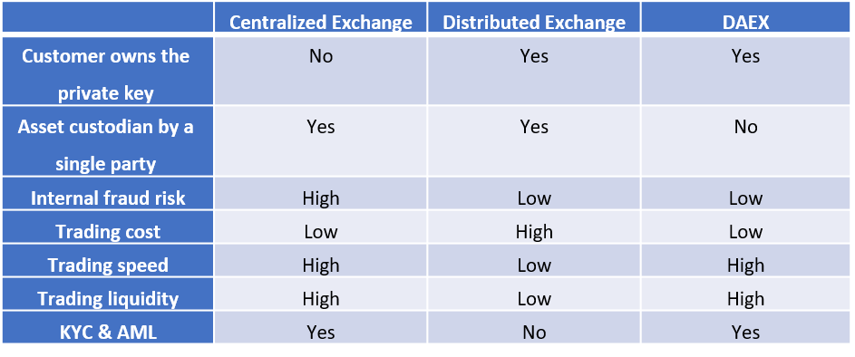 - Trust: all operation and assets are transparent on the DAEX blockchain. The transparency provides more certainty and decreases the distrust between the users and the exchanges.