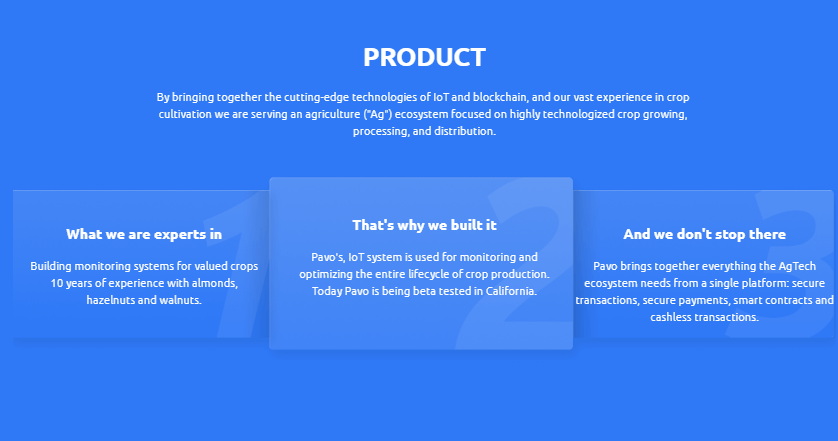 - Pavo's IoT-blockchain platform is transforming the agricultural industry and helps to manage and optimize intelligently the entire lifecycle of crop production.