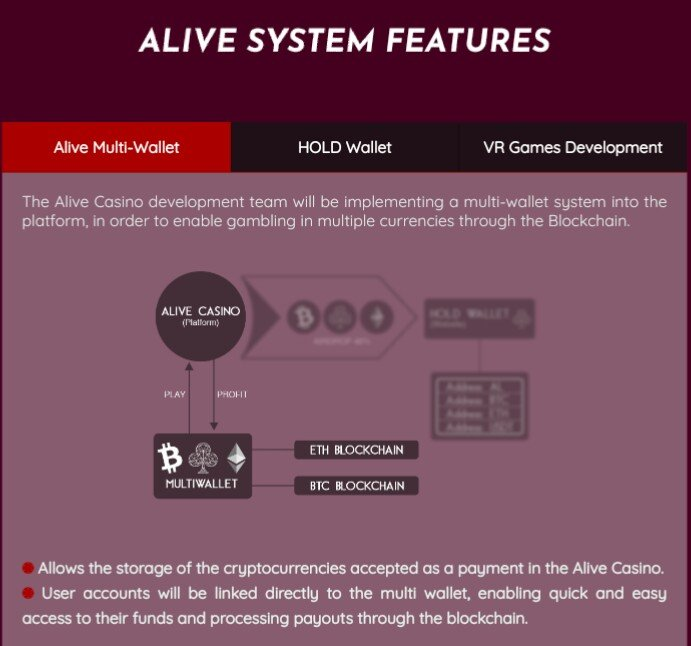 Alive Casino will implement a multi-wall platform system to enable multi-currency games via the Blockchain. Allows storage of cryptomoney to be accepted as payment at Alive Casino.