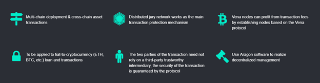 The Vena Protocol, which is a blockhain-based open source protocol, can easily provide financial services on DApps of service providers which are compatible to it. Service providers will be able to provide decentralized collateral lending, debt financing services and OTC trading of assets – crypto and fiat.