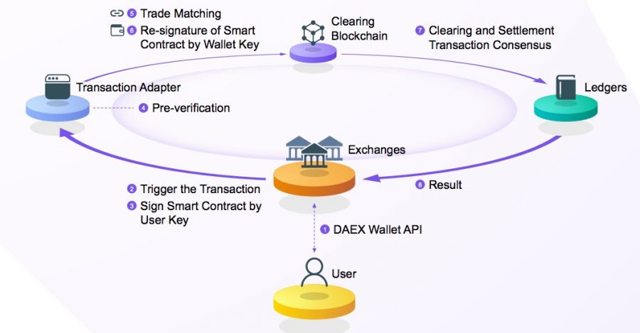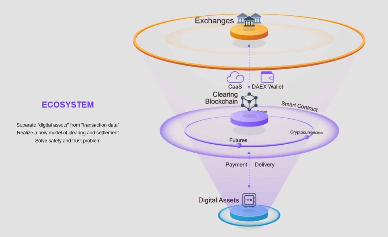 Daex построит работу таким образом, чтобы преимущества обеих платформ объединились и каждая в отдельности приносила свой вклад и выполняла определенную функцию на конкретном этапе, а именно централизованные биржи предоставляли торговые услуги, а клиринговые и расчетные услуги полностью опираются на решения Daex, это публичный блокчейн - гарант всех активов трейдеров, размещенных в их собственных аккаунтах.