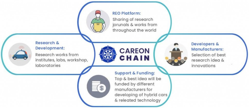 La plataforma de cadena CAREON unirá todo el trabajo de investigación de todo el mundo y proporcionará lo mejor a los fabricantes del sector automotriz. Es una red descentralizada que permite el almacenamiento de todo el trabajo de investigación de proyectos universitarios. Investigación científicamente probada para el desarrollo de tecnología híbrida en el sector automotriz.