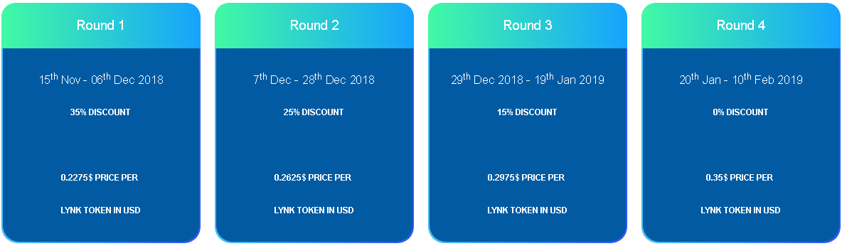The LYNK token sale will start on the 15th of November 2018 and continue till 10th February 2019. The entire sale has been broken down into 4 individual rounds with varying discounts to the base price (0.35 USD) for each LYNK token.