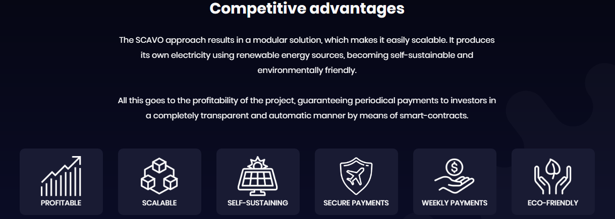 Scavo’s approach to the problem is modular, which results in a highly scalable solution, where energy (electricity) is produced from renewable sources, making the process sustainable and environmentally friendly. Scavo guarantees weekly payouts to users in a completely secure and automatic manner through the use of smart contracts which are based on the blockchain platform.