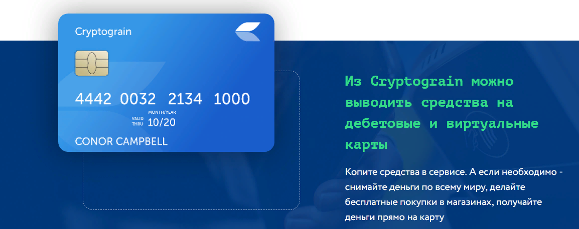 Накопленные средства можно использовать для совершения покупок или вывести из системы Cryptograin на виртуальную или дебетовую карту по всему миру.