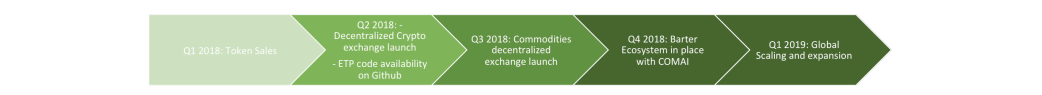 Как только продажа токенов будет завершена, команда платформы приступит к запуску крипто-биржи, на которой пользователи смогут торговать криптой и цифровыми активами, это позволит платформе собрать как можно больше отзывов от пользователей. С ETP и COMAI на биржу, в то время как особенности рынка чейнджер для бирж отраслей, поскольку ни одна из существующих бирж или торговых площадок предоставляет своим клиентам такие инструменты как Trailing Stop, Stop Loss Limit, Take Profit, Stop Loss Код смарт-контрактов ETP будет доступен в качестве открытого источника для Github для непрерывного развития и обратной связи с сообществом, он будет включать в себя набор смарт-контрактов, регулирующих любую торговлю или транзакцию на платформе.