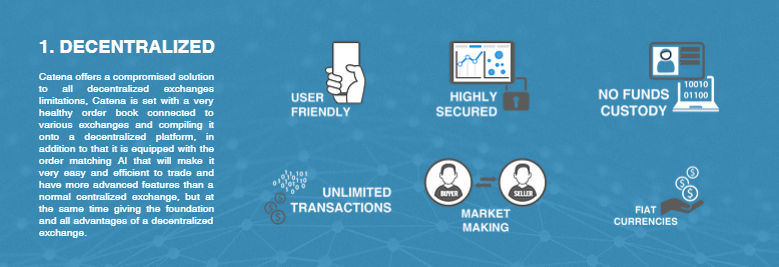 Catena стремится применять революционные технологии и алгоритмы, использующие технологию блокчейн, для того, чтобы построить надежную платформу, которая разрушит и в конечном итоге изменит, как работает торговая экономика. Catena - децентрализованная торговая платформа и биржа, построенная в основном на технологии блокчейн и представляющая новые алгоритмы и протоколы ИИ для повышения торговой экономики.