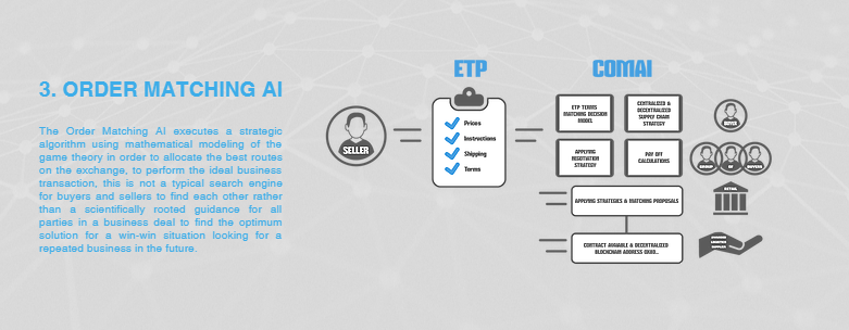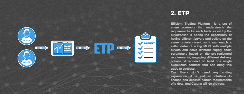 ETP представляет собой набор смарт-контрактов, что понимает требования для каждой сделки, установленные t он покупатель/продавец и сопоставляет их в соответствии, он открывает возможность наличия различных покупателей и продавцов в одном заказе/договоре, как он может соответствовать продавцом заказать большой Moq (количество минимального заказа) с несколькими покупателями и решать различные цепочки поставок параметров на основе предварительно зарегистрированных требованиями, привлекая различные варианты доставки, если это требуется, чтобы построить один исполняемый контракт, который может принести эту торговлю к успеху.