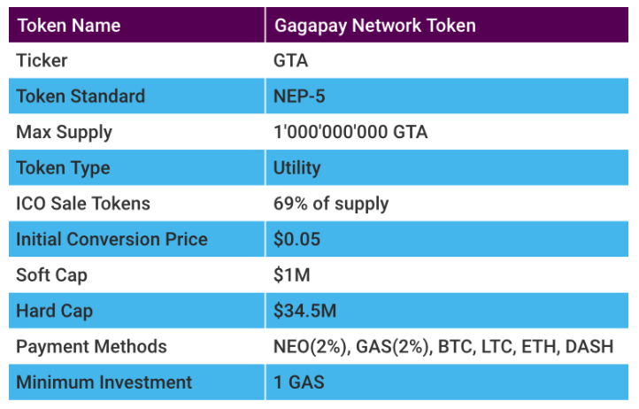 Инвесторы участвующие в предварительной продаже получат 40% бонусов. Минимальное вложение ограничено суммой $100. Максимальная инвестиция — $5000. Для предварительной продажи в рамках ICO будет предложено 200 миллионов токенов GTA, базирующихся на платформе NEO.