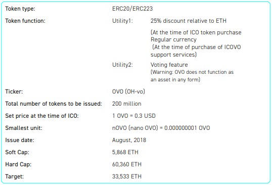 OVO: ICO investors who use OVO to purchase tokens for projects drafted on the ICOVO platform get a 25% discount compared to using ETH. Because OVO is an exchange-listed token, its price fluctuates against ETH. For this reason, the rate for the 25% discount against ETH is set at whatever the rate is just before each drafted project's token sale begins (resulting in the discount rate continuing to fluctuate throughout the token sale).