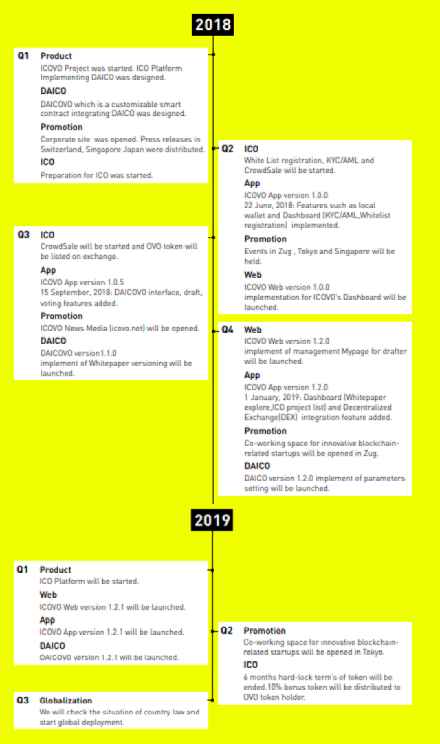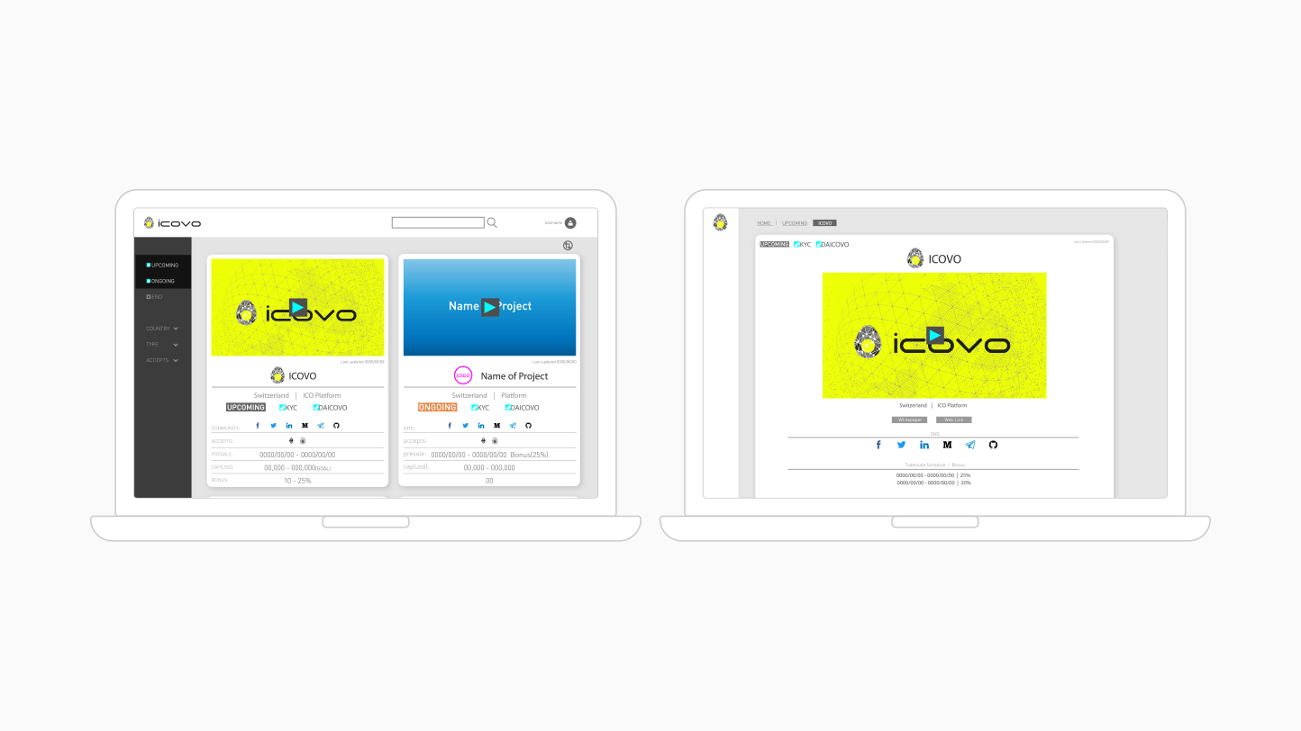 - ICOVO Web: ICOVO Web is a website for ICO project founders to list their ICOs for investors. It thoroughly protects ICO investors and lists only ICO projects that comply with ICOVO requirements. The criteria for listing on ICOVO are the utilization of DAICOVO, planner KYC/AML as required by ICOVO, and disclosure of the progress of the project.