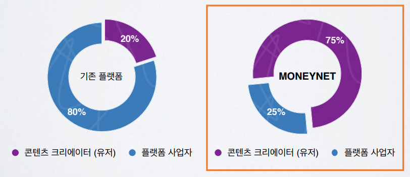 ▲콘텐츠 수익 분배 구조 비교 (좌, 기존 플랫폼 우, 머니넷)
