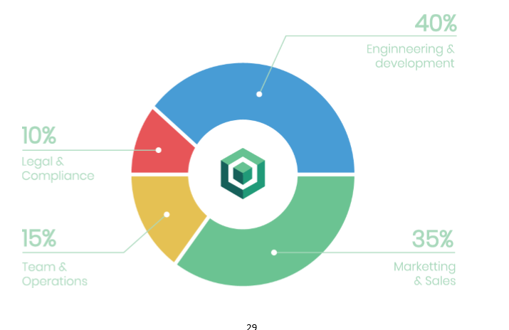 The budget outlined below presumes a scenario where our minimum cap of $ 5 mil-lion has been reached. Additional funds raised after the minimum cap will be used to add additional features to the application, API development, research, marketing and overall growth of the platform. Funds raised from the ICO will be distributed as follows: