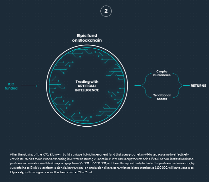 После закрытия ICO Elpis построит уникальный гибридный инвестиционный фонд, использующий собственные системы на базе искусственного интеллекта для эффективного прогнозирования движений рынка при выполнении инвестиционных стратегий как в активах, так и в криптовалютах. Розничные или неинституциональные/непрофессиональные инвесторы с холдингами от $ 5.000 до $100.000 будут иметь возможность торговать как профессиональные инвесторы, подписавшись на алгоритмические сигналы Elpis. Институциональные или профессиональные инвесторы, с холдингами, начиная с $ 100.000, будут иметь доступ к алгоритмическим сигналам Elpis, а также иметь акции фонда.
