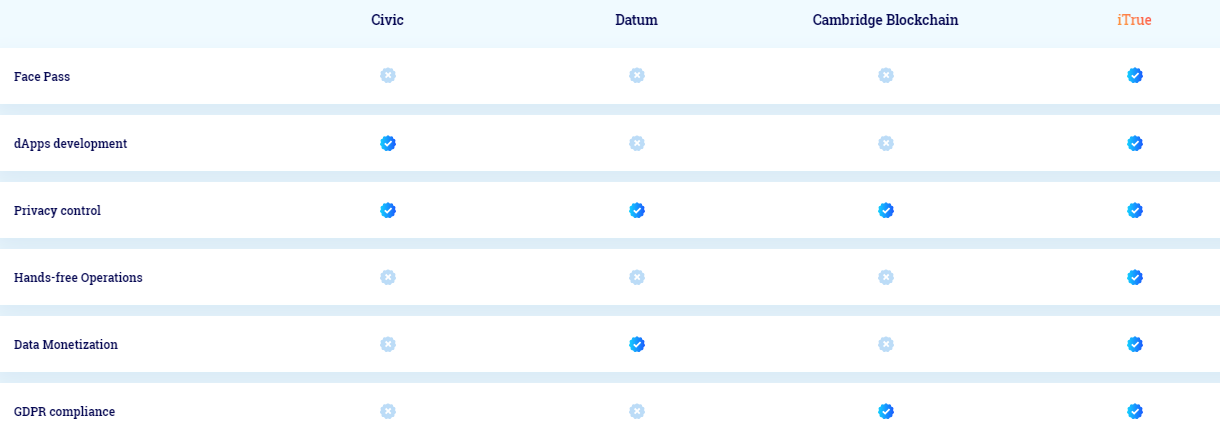 iTrue es una solución Blockchain-as-a-Service (BaaS) que cuenta con un sistema de autenticación integrado con datos biométricos como su servicio principal de microservicio. Las empresas y los desarrolladores pueden usar la plataforma para autenticar a sus usuarios, crear su propia red blockchain y obtener recompensas de un intercambio justo de datos. Los usuarios pueden usar la plataforma para autenticarse de forma cómoda y segura, controlar el uso de sus datos y ganar compartiendo sus datos personales de forma controlada.
