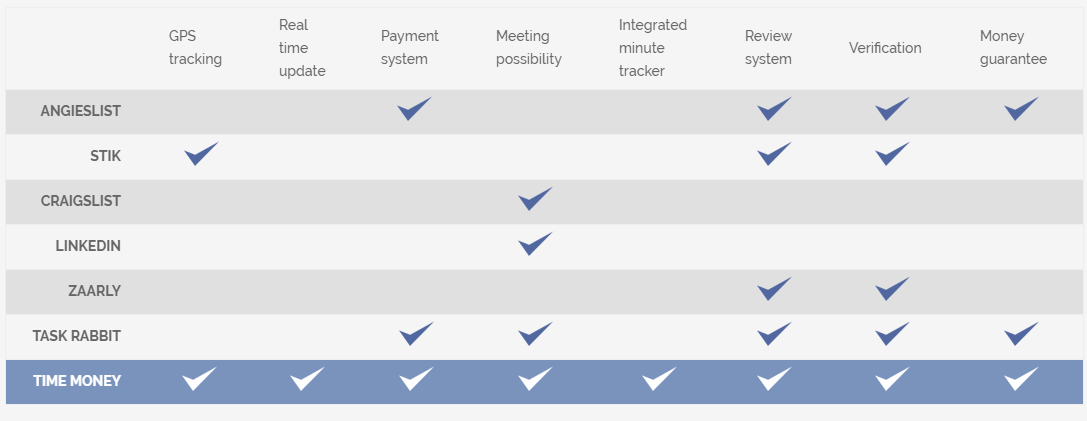 Actualmente no hay ninguna otra aplicación en el mercado, lo que permite proporcionar cualquier conjunto de habilidades a pedido y recibir ese tiempo calculado por minuto. Las aplicaciones bajo demanda bien conocidas están orientadas a nichos, por ejemplo, Uber es para viajes, Airbnb es para alquileres, sin embargo, no existe una solución unida y descentralizada. Vemos que la reunión a pedido, el mercado laboral está creciendo y el valor real es el tiempo. La tendencia actual en todo el mundo es que la gente salga de 9 a 5 empleos, por lo que nuestra plataforma es el siguiente paso lógico para eso.