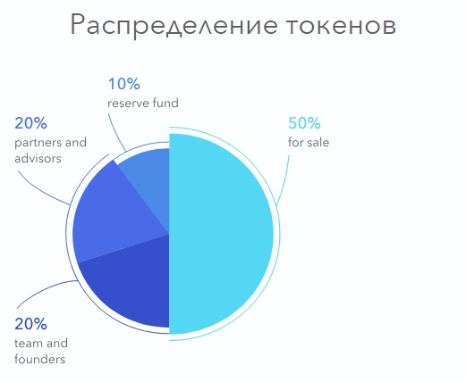 50% продажа токенов, 20% партнеры и консультанты, 20% команда и учредители, 10% резервный фонд.