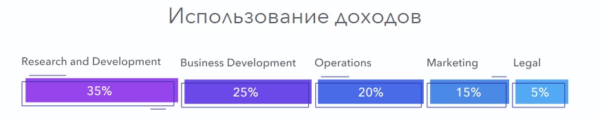 35% исследования и разработки проекта, 25% бизнес и развитие, 20% операционные расходы, 15% маркетинговая компания, 5% юридические расходы.