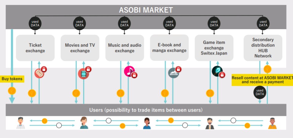 At ASOBI MARKET, anybody can trade digital content, as well as sell and buy between other users. ASOBI market is a P2P style distributed secondary content platform for buying and selling digital products (games items, comics, music, softwares, e-books, e-tickets, videos and more). The ASOBI platform is blockchain based, and it is fortified with a Decentralized Security System (DSS) that provides a protected system to distribute secondary (used) content.