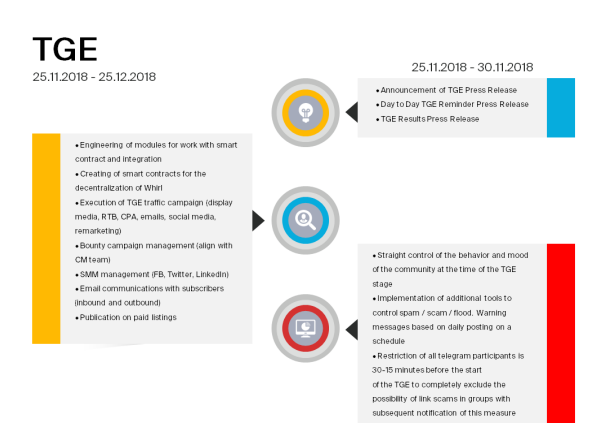To seed and promote a community, in addition to raising funds for global expansion, WHIRL will host an initial Token Generation Event (TG E). The TGE will be conducted simultaneously on tokensale.whirl.com and kickico.com in order to maximize the amount of the raise and the number of participants.
