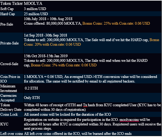 - Full moolyacoin offered on ICO: 480,000,000 (Pre Sales, Private Sales & Crowd)