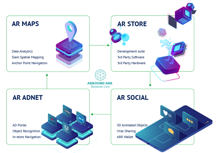 The basic principle of ARROUND is to provide anyone, both platform users and commercial entities, with the ability to create, publish and distribute AR experiences, safe in the knowledge that all property rights and privacy and commercial interests of all parties are guaranteed by smart contracts, and that payment is free the friction and transparency of each exchange is also governed by this same contract.