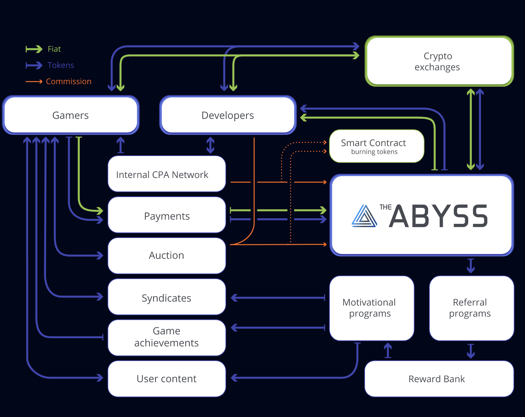 Token ABYSS (ERC20) will be the main mechanism on the Abyss platform. Most of the various internal services will use the ABYSS card. Your earnings will also be paid with a token.