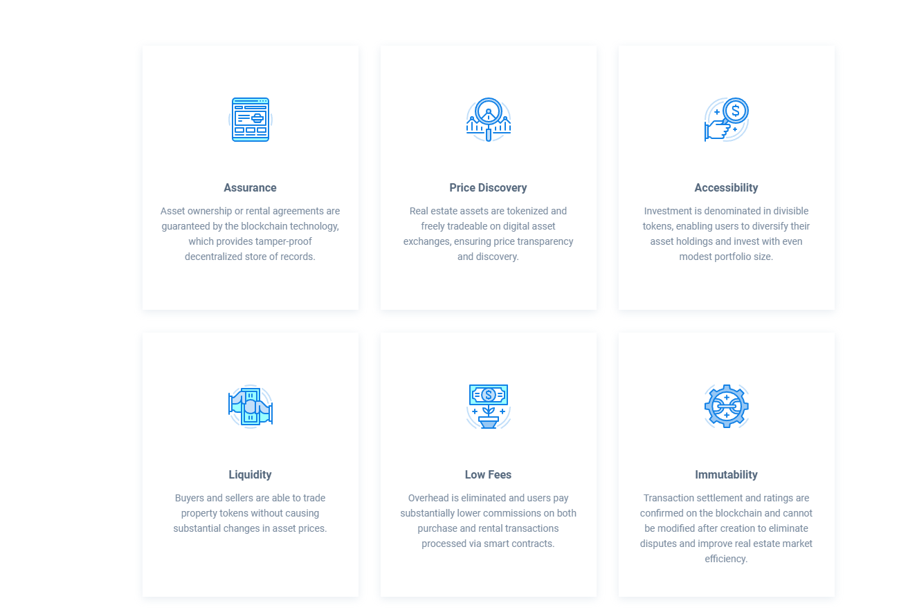 Новый проект специализируется на аренде недвижимого имущества. Занимающийся проблемами спорных вопросов и более низкой процентной ставкой комиссионных арбитраж, будет децентрализован. И это неоспоримый плюс в таких делах. Рынок «P2P», работающий без привлечения посреднических структур и неизменяемая передовая технология блокчейн, позволяющая обнародовать действительные рейтинги и отзывы также будут иметь преимущества, по сравнению с обычным рынком недвижимости.