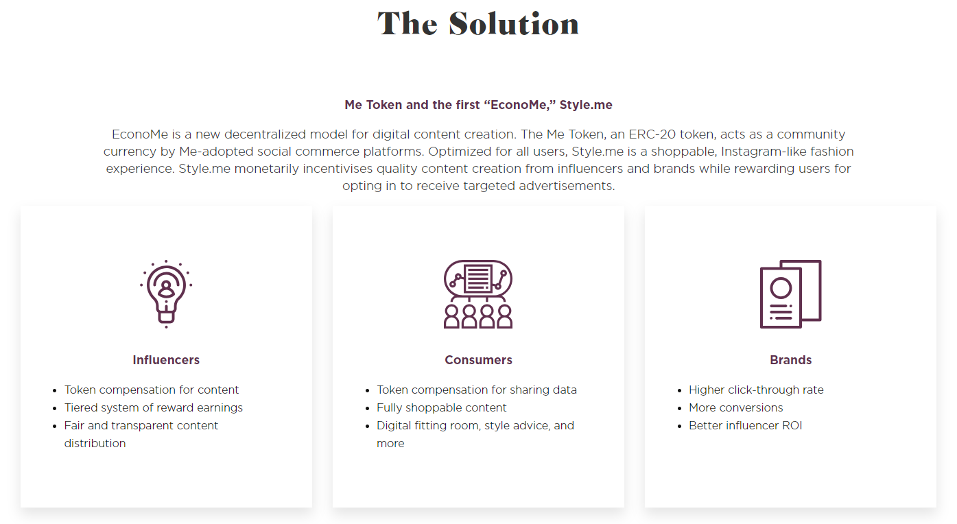 EconoME будет функционировать как влиятельное и пользовательское сообщество, состоящее из разных платформ, включая Style.me, и это может помочь быстро интегрировать пользователей, у которых мало опыта работы с криптовалютами . Новые платформы используют уже существующую потребительскую базу для того, чтобы начать активно заниматься торговлей внутри глобального сообщества. Такой подход позволяет сделать отношения между всеми пользователями этой уникальной платформы действительно доверительными и взаимовыгодными.
