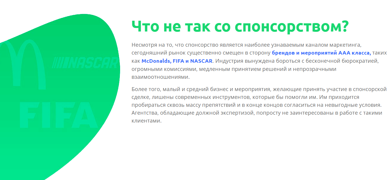 Спонсорство является весьма важной частью сегмента маркетинга. Но сегодня рынок поддерживает только крупные проекты, которые уже приносят огромную прибыль, к примеру, FIFA является более приоритетным, чем неизвестное дело, не показывающее сиюминутных результатов. Все дело в том, что в большинстве случаев посредники работают слишком медленно, бюрократические процедуры отнимают много времени. Большинство централизованных платформ не могут похвастать прозрачностью, что приводит к неприятностям различного масштаба. Представители малого бизнеса зачастую не получают необходимых инвестиций - нет платформ, позволяющих это сделать. В большинстве ситуаций различные препятствия не позволяют компаниям получить финансирование, что пагубно сказывается на их дальнейших перспективах.