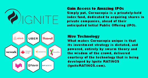 Easier, Cornucopia is a private index fund, dedicated to acquiring private shares of the company, in front of the Initial Public Offering (IPO) they anticipate. What makes Cornucopia unique is that its investment strategy is dictated, and supported, entirely by swarm theory and the wisdom of the people, is conveyed for the goodness of the technology being developed by Ignite RATINGS (IgniteRATINGS.com). Obtaining shares in private companies before the anticipated IPO always provides an exclusive set of accredited investors with the potential for large returns in a class of speculative assets that have a minimum correlation to overall market sentiment. Like investment, evaluation and selection of opportunities that are present are very important for success, or not, of investment. Utilizing Ignite's platform, Cornucopia is able to harness the wisdom of crowds to assess and assess the best opportunities in the pre-IPO arena and, in theory, outperforms every individual assigned to make the same decision, resulting in higher profits. After the crowd had identified an attractive investment, the Cornucopia Index spread capital by buying shares / options / warrants in the pre-IPO selected by the company. When the Cornucopia Index closes a favorable position, the benefits of trading are distributed to those members of the Cornucopia community who provide analysis that contributes to trade. The result is an opportunity for all Cornucopia token holders to benefit from promising profitability and business growth outside of the often changing crypto ecosystem ... a benefit normally provided specifically for accredited investors.