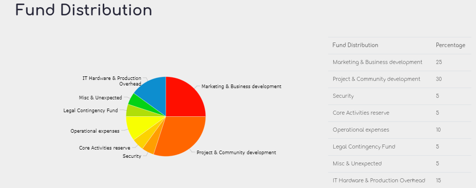 ICO satışından elde edilecek gelirlerle, marketing ve iş gelişimi için %25, proje ve topluluk oluşumu için %30, güvenlik için %5, şirketin ana faaliyet giderleri için %5,operasyonel giderler için %10, yasal giderler için %5, bilinmeyen giderler için %5 ve IT donanım ve üretim giderleri için %15 olarak yukarıdaki şekilde paylaştırılacaktır.