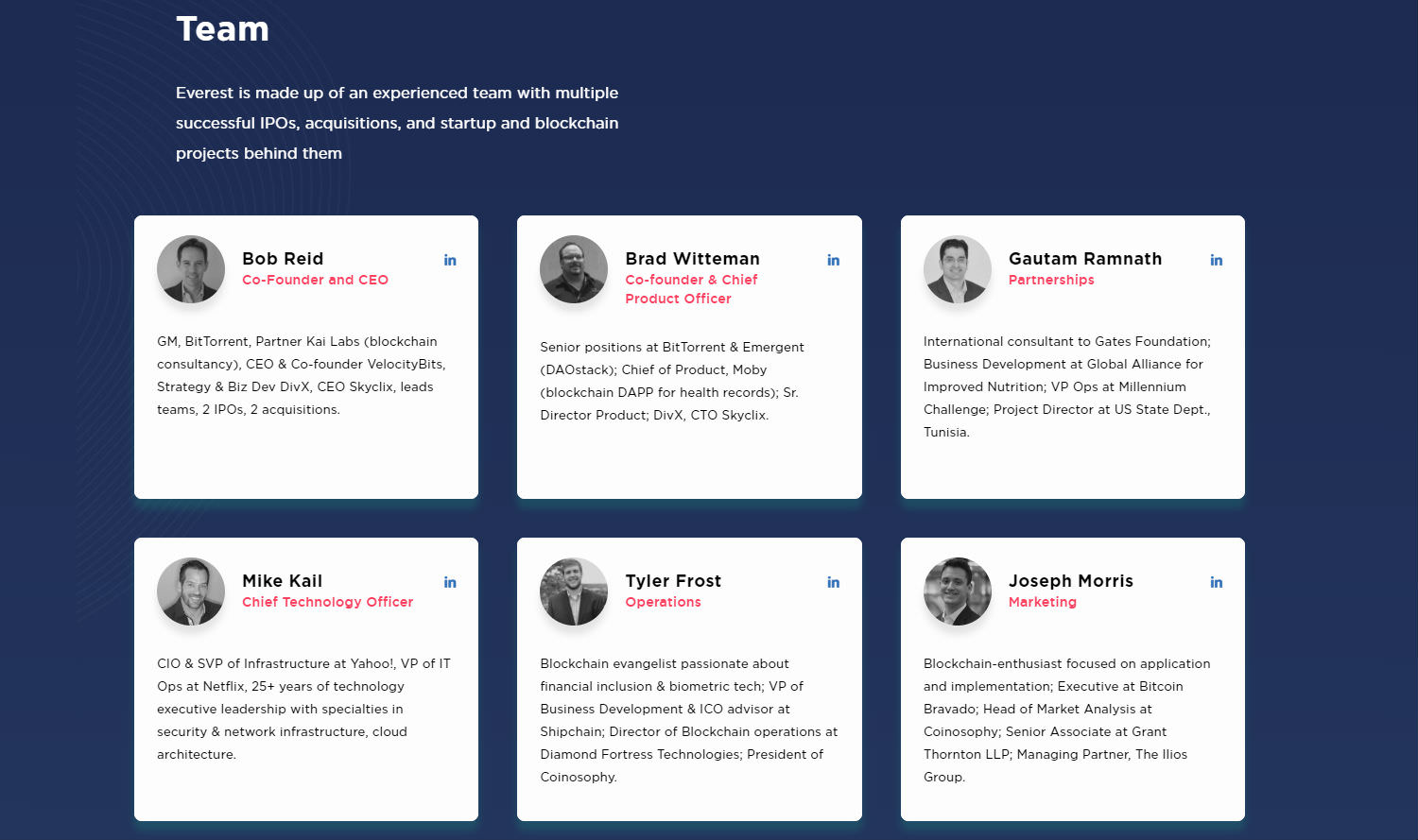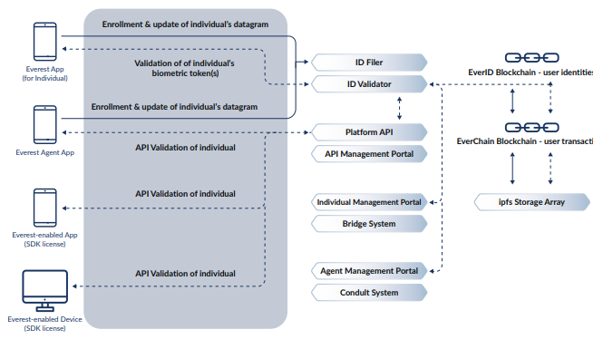 Everest ha construido una plataforma descentralizada formada por tres componentes: EverID, un sistema de identidad biométrica digital para almacenar y confirmar los datos de identidad del usuario; EverWallet, un monedero digital multidivisa con almacenamiento de documentos incorporado, y EverChain, un sistema de transacciones basado en blockchain. La plataforma está disponible para todos los seres humanos desde el nacimiento hasta la muerte. No requiere un dispositivo móvil para unirse, está encriptado para proteger la privacidad de los usuarios y es interoperable con otros sistemas. Las instituciones, corporaciones y organizaciones gubernamentales pueden validar de manera efectiva, barata y rápida la identidad del usuario a escala. El valor puede transferirse de forma segura al destinatario correcto con costos de transacción reducidos, menores pérdidas por fugas, innovaciones en el servicio y transferencia de valor.
