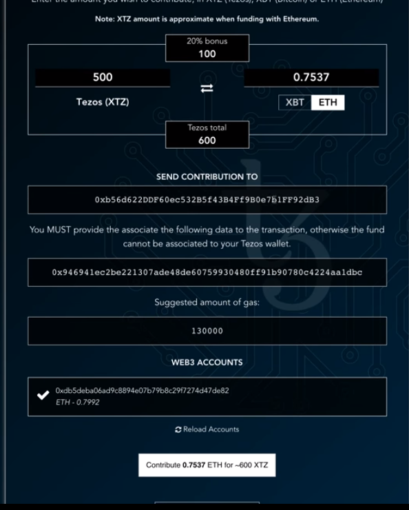 | Rate | 5,000 XTZ / 1 XBT(비트코인) + BONUS. 이더리움의 경우 해외거래소의 rate를 반영함 |