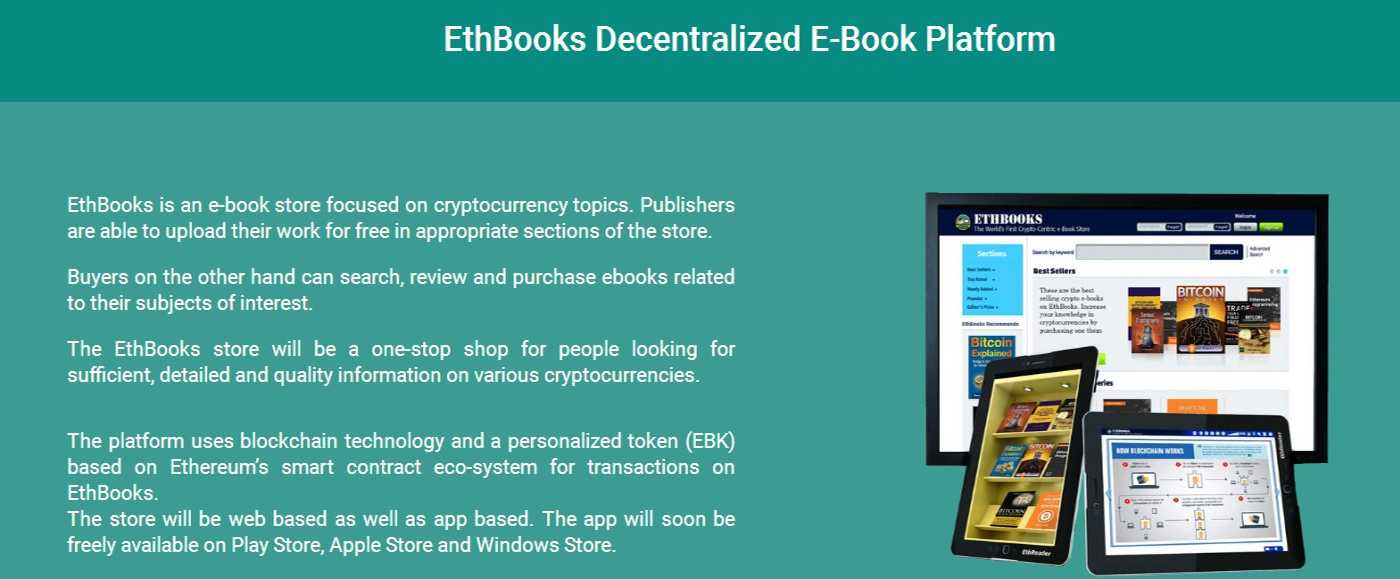 Based on the same concept, EthBooks is the world's first e-book store which is dedicated exclusively to cryptocurrency topics. The EthBooks store will be both web and app based. Having seen a rise in cryptocurrency and so many cryptocurrency records broken in the last year, cryptocurrency has become a topic of discussion. Demand for quality information on cryptocurrenciesis what led to EthBooks' inception. EthBooks has various features like Search Engine, Best Sellers' Section, Top Rated Section, Editors' Picks, etc. The main payment method will be EBK token which can be bought either on EthBooks or through other token exchanges. EBK tokens are ERC20 tokens. Users are free to store these tokens on EthBooks store and use them for future purchases.