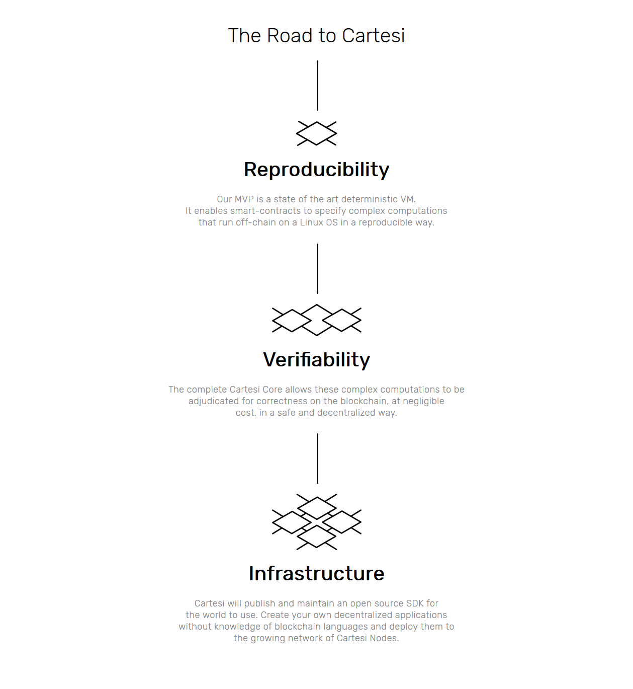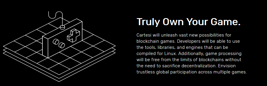Cartesi is a decentralized and scalable Linux infrastructure that addresses issues of computational scalability and development infrastructure for the decentralized web. With Cartesi, blockchain applications can be coded with the broad domain of mainstream software stacks available today. Applications run off-chain with blockchain's strong security guarantees but are free of its computational limitations and high costs.