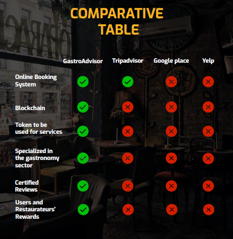 GastroAdvisor is the first ever global recommendation platform, using the blockchain technology (Ethereum platform) specially aimed at getting the best experience out of restaurants and dining venues. GastroAdvisor, was trademarked in Switzerland in 2016. Owing to the participation of several people, GastroAdvisor became a platform for research, recommendation and booking of restaurants and food places around the world. GastroAdvisor collaboratively works with users of these places to create high quality, transparent and trustworthy information.