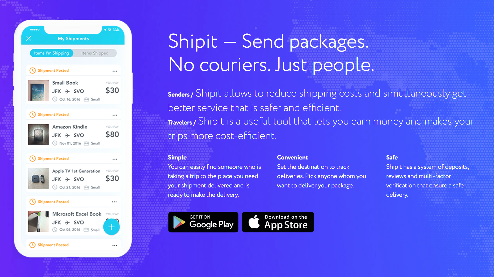 Shipit is a symbiosis of best ideas and practices of courier, crowdsource and crowdshipping services. We have synthesized the best business practices to create a revolutionary and unique service. Just as Uber and BlaBlaCar have already become a part of our daily lives, Shipit is going to become an irreplaceable tool for shipping.Mobile Application that connects senders and travelers from all over the world to provide a cost-efficient, fast and reliable solution for shipping parcels. Besides, it is an excellent way to make additional earnings during the trip. Shipit will help establish new supply chains, make complex processes simple and will increase efficiency of baggage space usage.