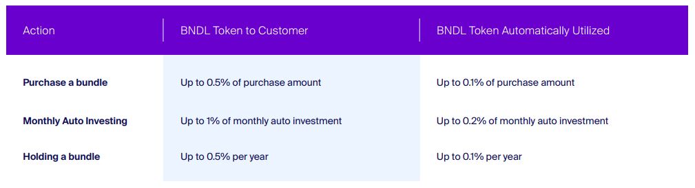 BNDL tokens will be used as rewards for users who invest in bundles for an extended period of time. Besides every user will get BNDL token rewards for their purchases. In addition, users will be rewarded with BNDL tokens if they set automatic investment option on. Granting of bonuses will also utilize / burn BNDL tokens back into the platform to keep the bonus distributions within manageable levels and to maintain equilibrium as the assets under management on the platform increase. Below table explains the percentage of BNDL token awards and utilization.