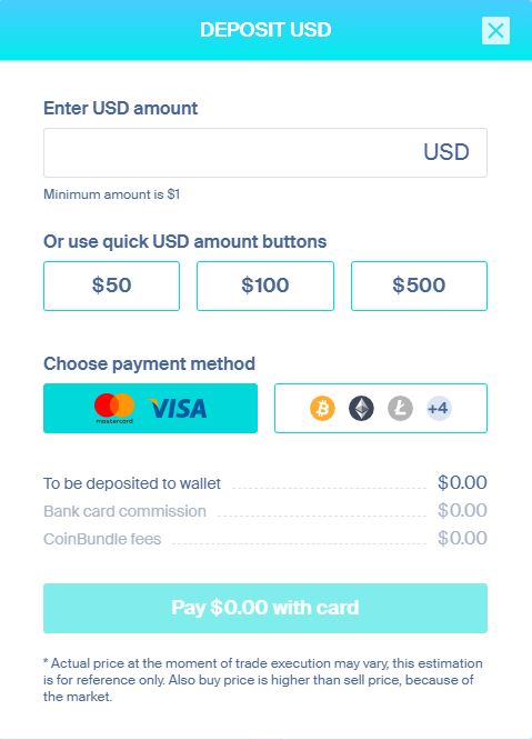 Users could deposit funds to their accounts by debit and credit cards or cryptocurrencies such as, Bitcoin, Ethereum, Litecoin, BitcoinCash, Dash and Ethereum Classic. Users can also set up automatic funding to their wallet on a recurring basis.