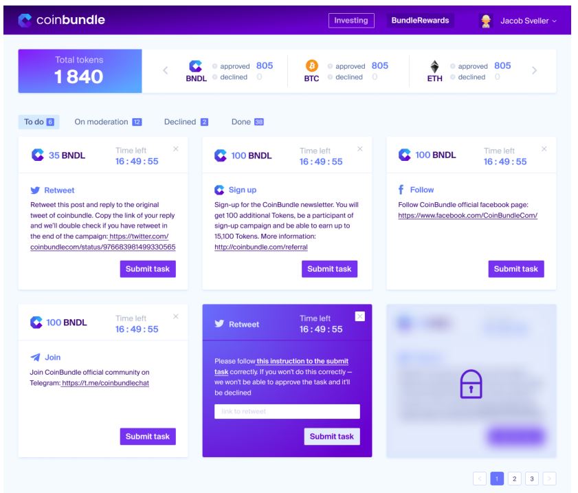 BundleRewards is a platform where CoinBundle users is capable to earn tokens in return for doing micro-tasks, governance participation, and activities on and off the platform. Users will be able to earn BNDL, for instance, for providing evidence of completing basic financial literacy courses developed by the platform, or for routinely saving and investing a portion of their earnings every month. Eventually, BNDL token holders will be able to reward other users for their microtasks delivered as well.