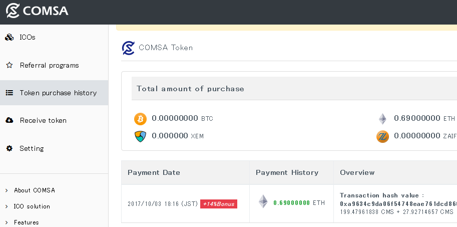 Today I decided to take part in COMSA ICO with 0.69 ETH (aprox. 200$ of current ETH/USDT prices).