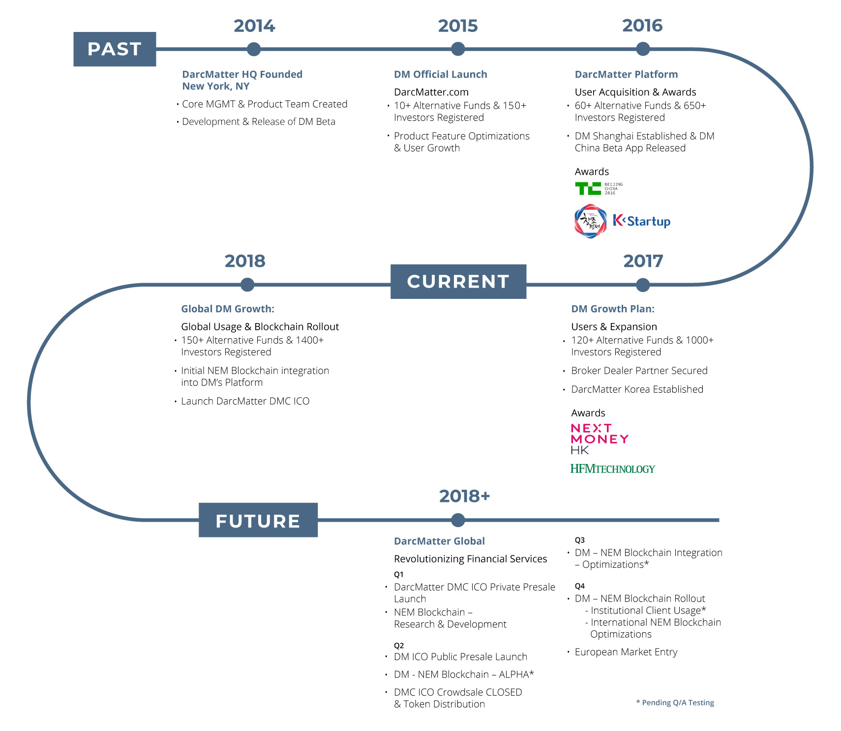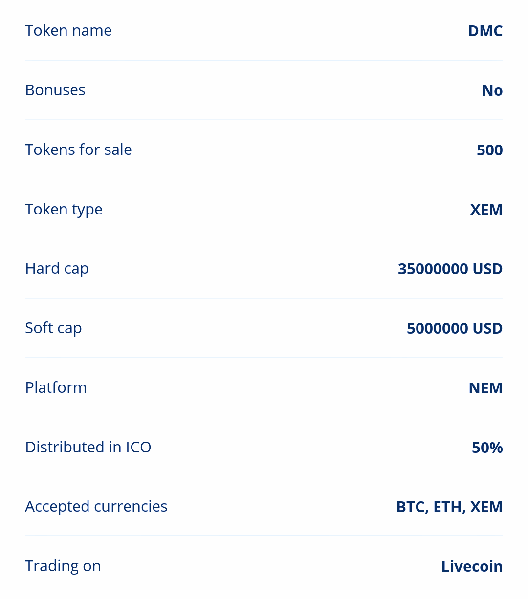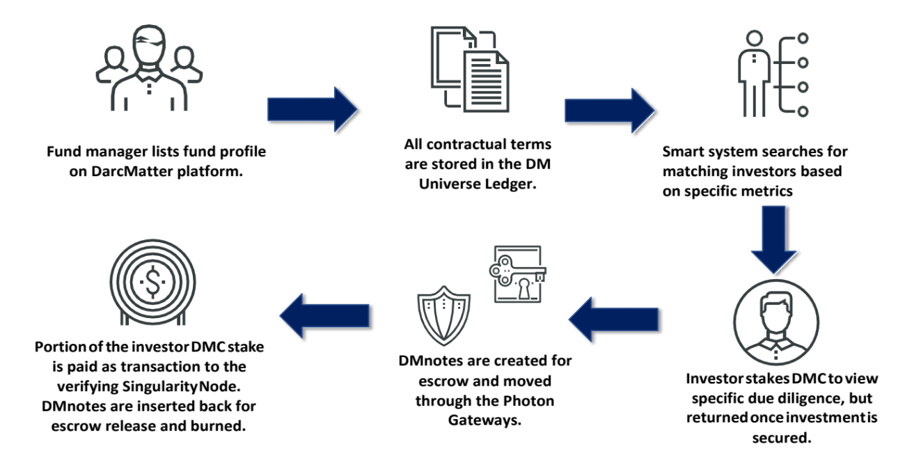 DarcMatter Coin (DMC) is a utility token that will be used by fund managers and investors to create smart contracts for the investment completion process, and will also be used to access due diligence reports, KYC, and AML details.