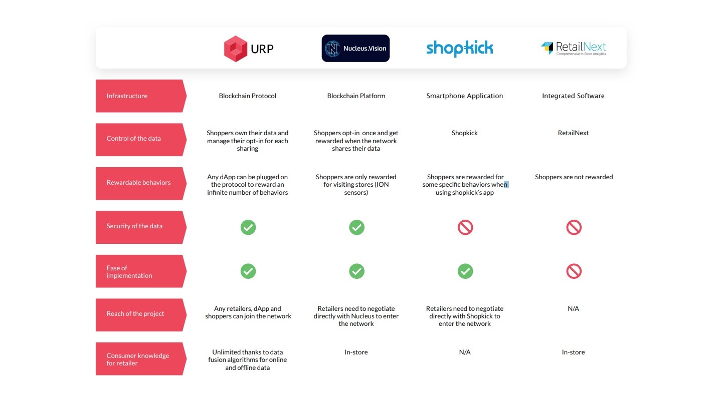 Universal Reward Protocol, as a blockchain-based protocol, enables any retailer to join the network and easily create reward campaigns using smart contracts while granting shoppers full control and security of their data. The main advantage of Universal Reward Protocol is to be able to reward multiple behaviors online and offline. Universal Reward Protocol team is already working with major retailers worldwide that gives a concrete competitive advantage in terms of business expansion. Universal Reward Protocol is competing with traditional rewarding programs applications like Shopkick and analytics solutions made for retailers like RetailNext. As for NucleusVision, its product enables