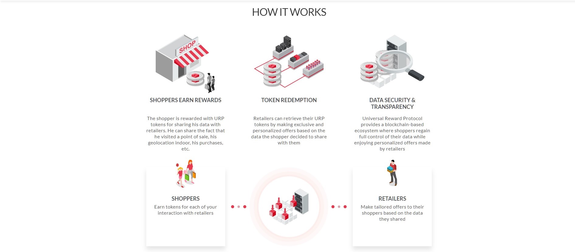 Universal Reward Protocol (URP) is a new way for retailers and brands to interact directly and transparently with their shoppers, and automatically reward their behavior and data sharing in a personalized, streamlined way. This blockchain-based protocol lets retailers reward shoppers for any type of shopping behavior, such as simply visiting a store. By accepting to share their shopping behavior data with the network, a shopper earns reward URP tokens, while the data is used by retailers to build redemption offers that best suit each customer’s needs. Shoppers can redeem their tokens through these exclusive and personalized offers.